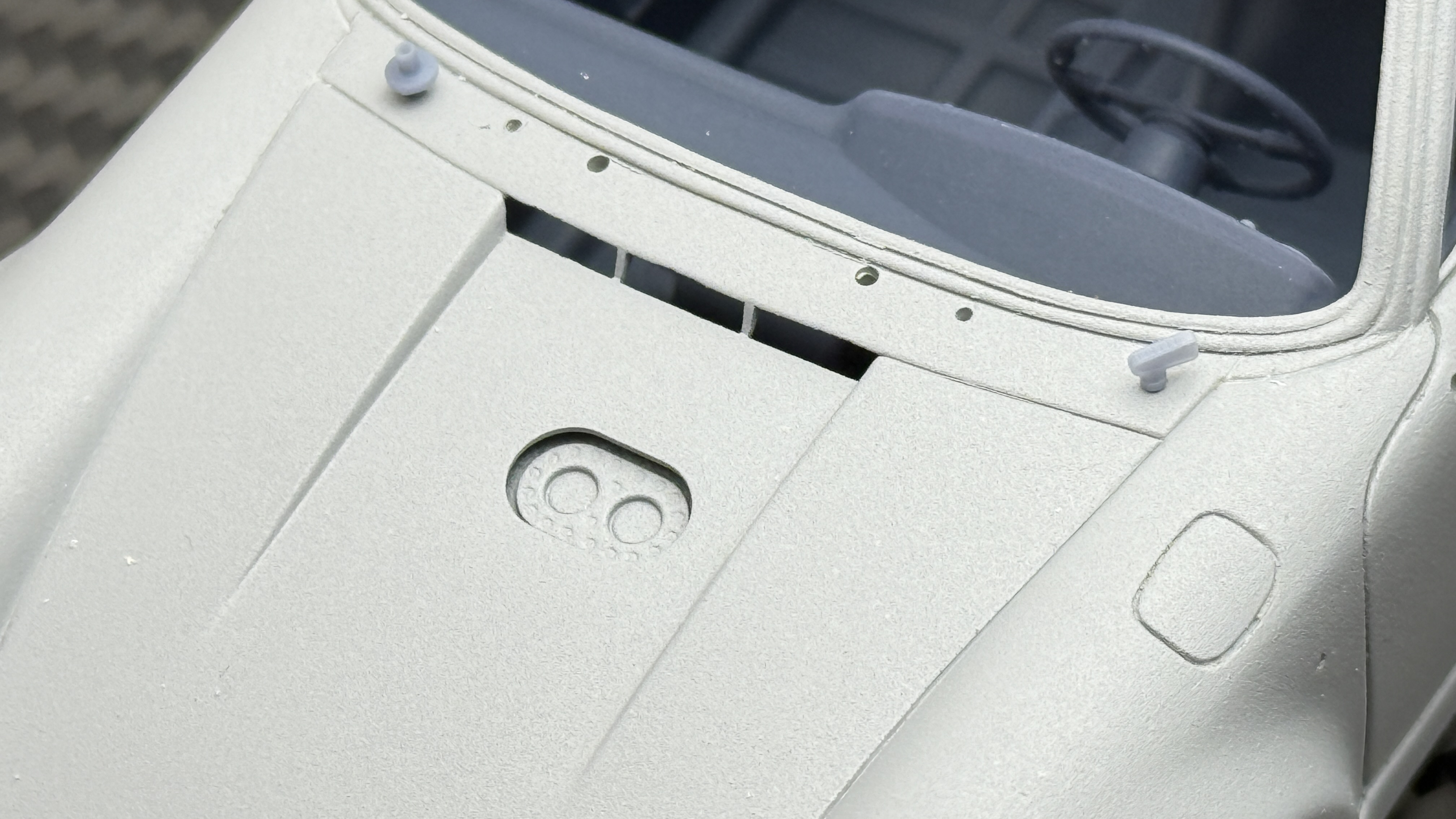 キットではデカール貼り処理のボンネット給油口は、パーツを埋め込む事でボンネットの厚みと距離感を出しながら立体的に再現。