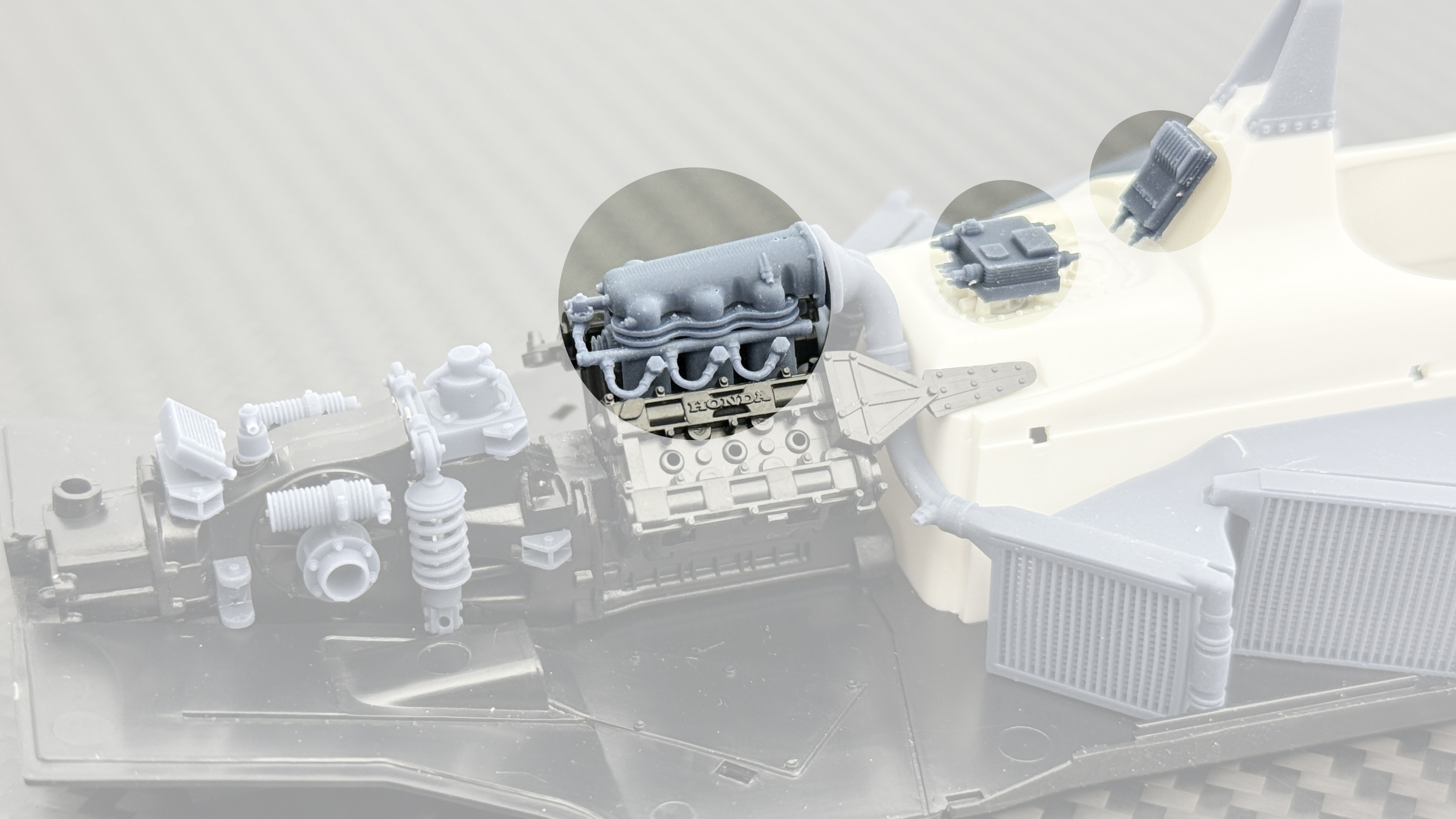 T社製ウィリアムズFW11コンピュータのコンピュータとエンジンのディティールアップ改造を手軽に行えるパーツセットです。
